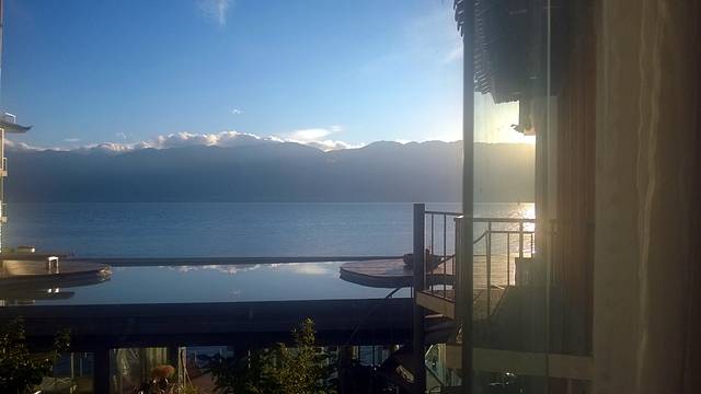 刚到双廊已经是下午6点,当天的天气不怎么好,时不时还会有点小雨,到了晚上7点多时隐约能看到夕阳,晚上8点,天还是亮的,这时的我们还没吃饭,主要是刚到酒店,已经被酒店的美景吸引驻足,一时忘记了肚子的呼唤!