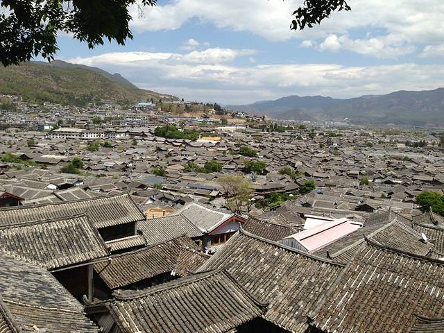 登高远望,丽江古城的灰瓦顶和远处的雪山。