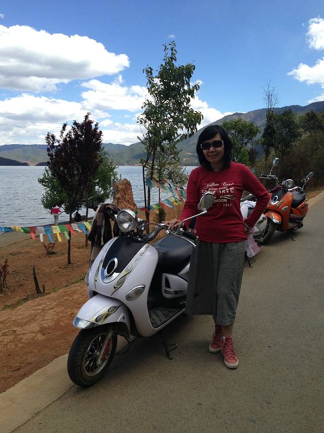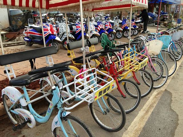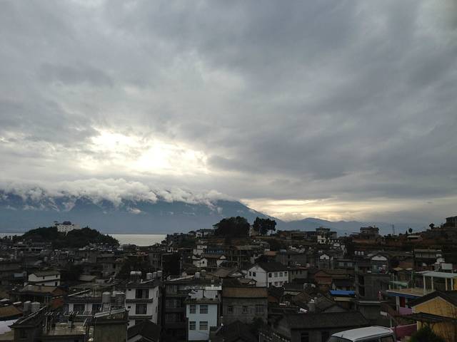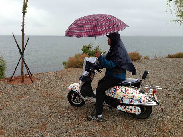 雨一直下着,影响了骑行洱海。干脆租了一辆电动车,40元,穿上雨衣,走走再看。