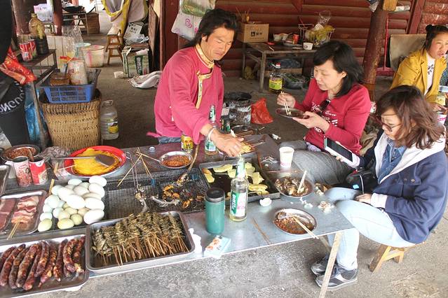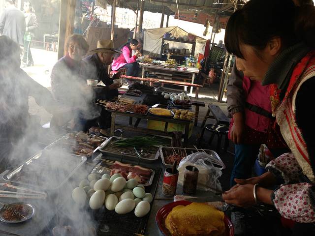 桥头,搭个几个棚子,人们在这里吃饭休息。主要是烧烤,有鱼,豆腐,香肠等。
