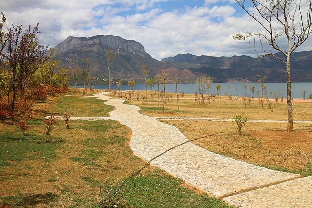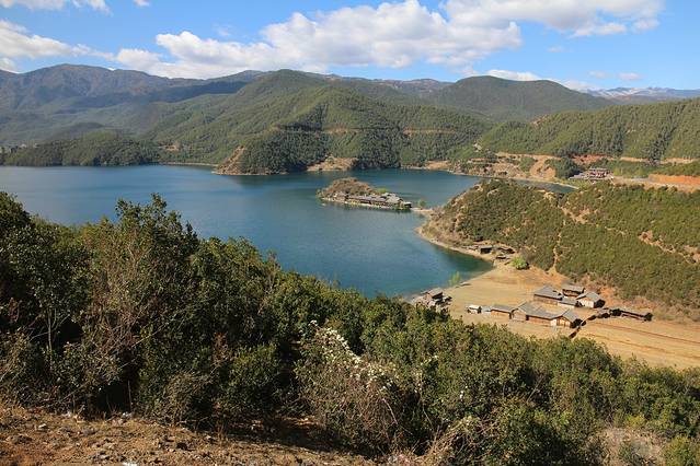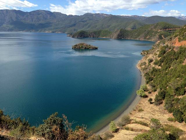 这是一条主路,路是细长的,通向远处的小岛。左手边是泸沽湖,右手边是客栈