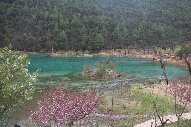 世外桃源蓝月谷,在晴天时,水的颜色是蓝色的,而且山谷呈月牙形,远看就象一轮蓝色的月亮镶嵌在玉龙雪山脚下,所以名叫蓝月谷。