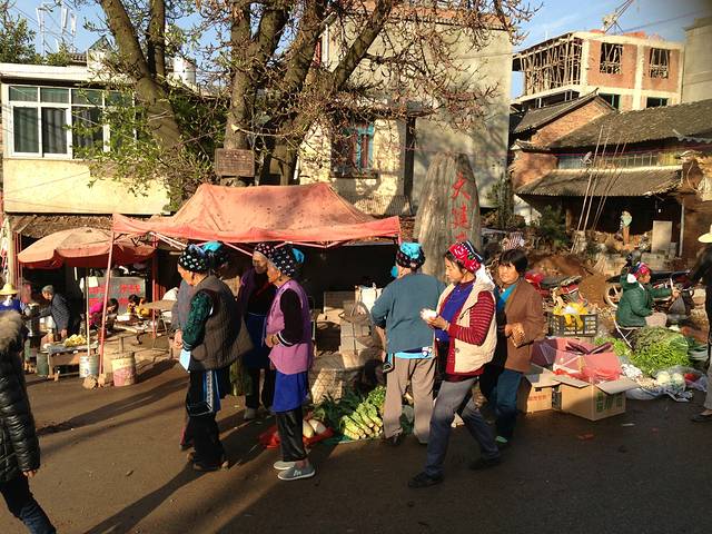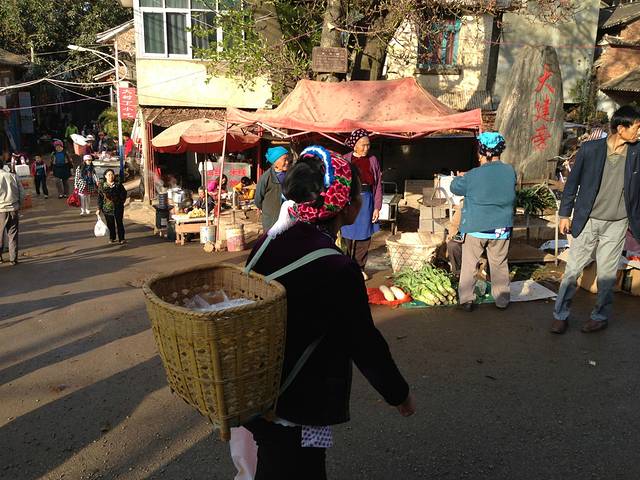 热闹的早市上,随处可见背着竹篓身着民族服饰的大妈大姐。