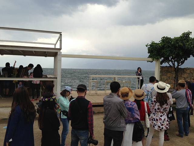 海地生活的闻名起因于这套海边的白色桌椅,就这个不阴不阳的天气,这里还是挤满了人,还好大家有秩序地排队。