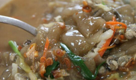 地瓜粉条,用地瓜粉做成的粉条Q滑有弹性,加上海蛎、猪肉及新鲜蔬菜,以及闽南特色的炸红葱头提味,十足鲜香美。
