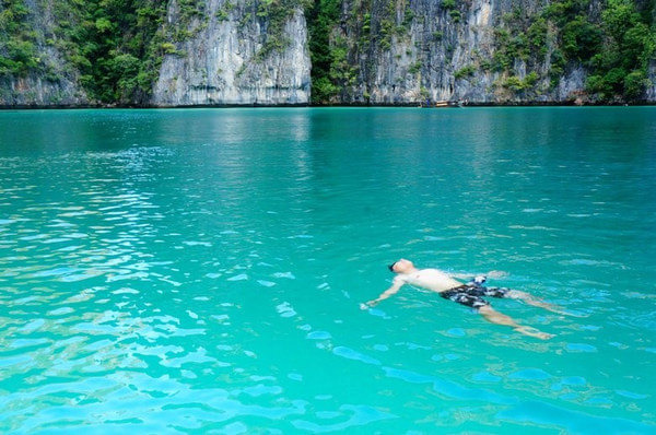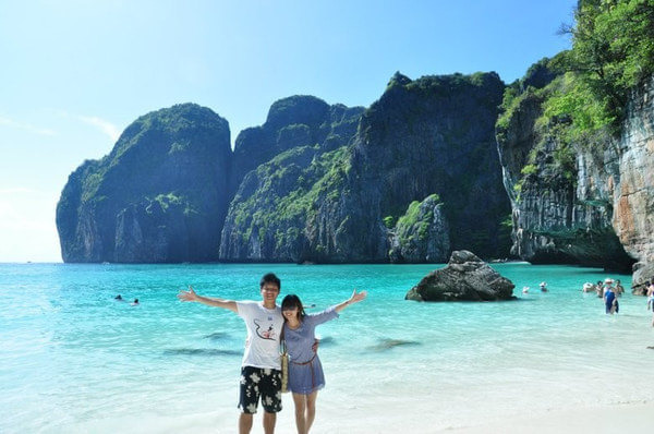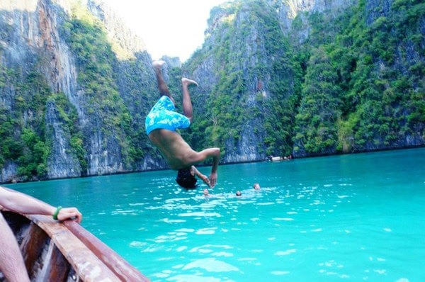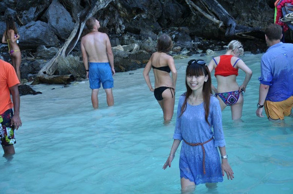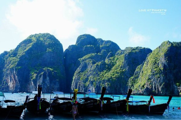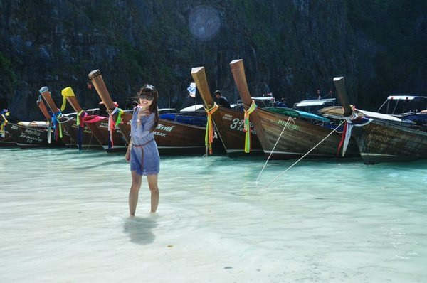 下午的行程是pp四岛的半日游,去了著名的maya bay,只可惜去时正巧游客大增,整个沙滩上全挤满了人,也就没拍出特别美的风景照。我们的时间相对充裕,离开maya bay稍晚,见游客如此之多,也就懒得拍照,直接在沙滩上躺下,枕着海浪的声音竟然足足睡着了一个小时,哥哥吧我叫醒之时已经是要离开的时候了,船继续行 进,把我们带到一个又一个的岛屿浮潜,你说pp是所有岛中水最清澈能见度最高的,我觉得pp的水是绿的那么不真实。。