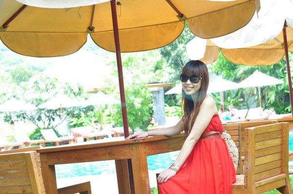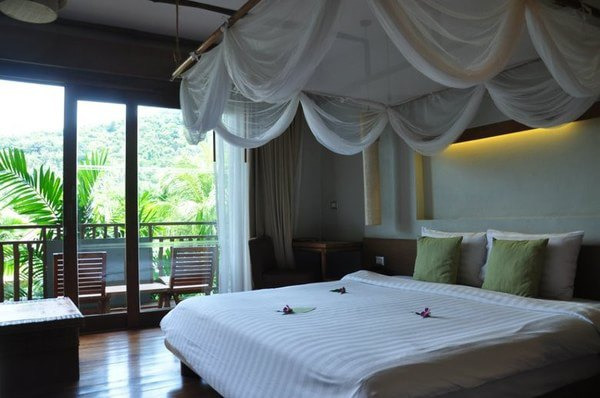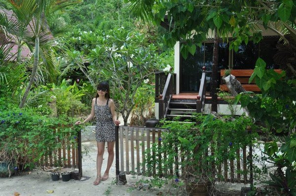 sunrise tropical 里的一栋小villa,两只躺椅,一个洒满阳光的飘窗,大大的落地窗躺在软软的贵妃椅旁,双脚放在露台的栏杆上, 听鸟鸣虫叫,看满园绿色。这里是krabi,Railay Beach。