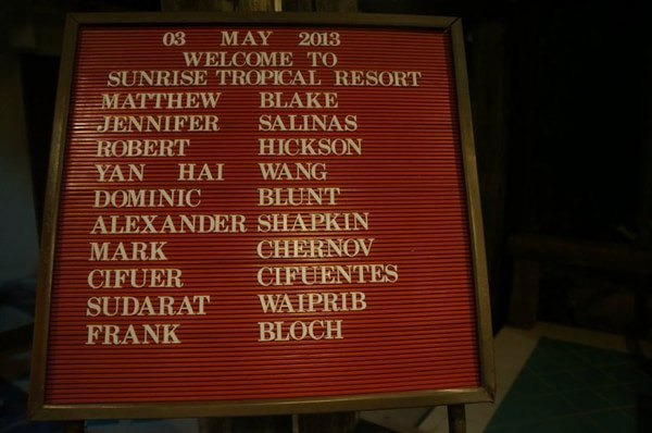回酒店的时候惊奇的发现,酒店竟然为每一位当天的客人竖了欢迎牌。看到自己的名字被搞颠倒觉得挺有意思。我们是酒店4天3晚唯一的中国客人。