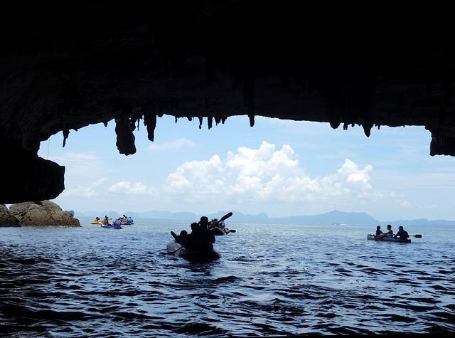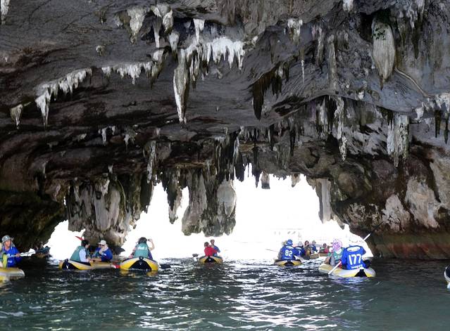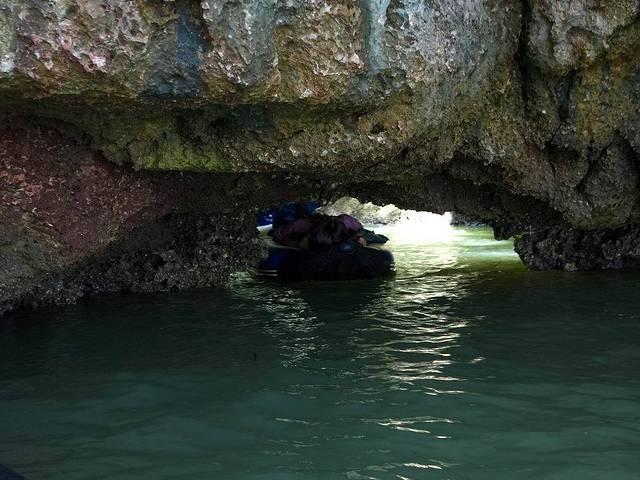 割喉岛每个山洞的形态不同,有的宽阔,有的狭窄到要躺在皮艇内才能穿过,既刺激又安全。
