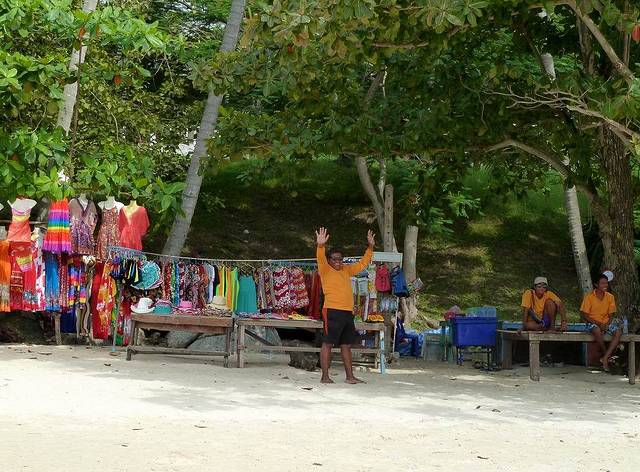 海滩上卖服装和游泳用品的商贩