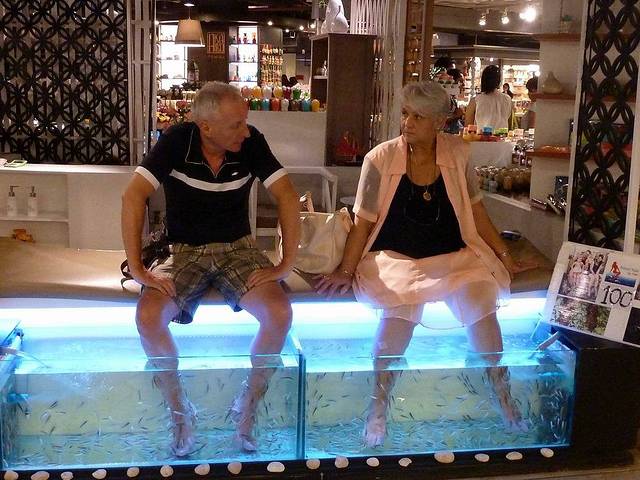 当天的最后一个旅游项目是小鱼SPA。在一个一米宽的水池里,有许多黑色的小鱼。洗完脚后,踏进水池,这些小鱼便都聚拢来,轻轻地咬着你的腿和脚。刚开始,感觉有些痒,后来,便是很舒服的感觉了。