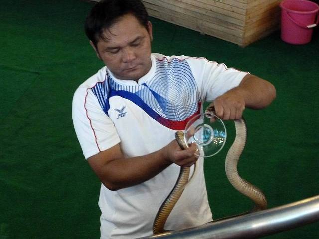 当天的第五站是毒蛇研究中心。据说,这是继巴西之后世界仅有的国家毒蛇科研机构,由泰国五世皇创办,目前由泰国皇家政府主办。在这里可一睹世界上最毒之金刚眼镜王蛇的芳容,同时可欣赏惊险的人蛇表演。这是表演者正在取蛇毒。