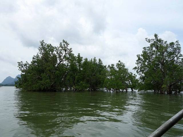 攀牙湾内遍布珍贵的胎生植物——红树林,枝干上长出众多支持根扎入泥滩里,以保持植株的稳定,任凭风急浪高。