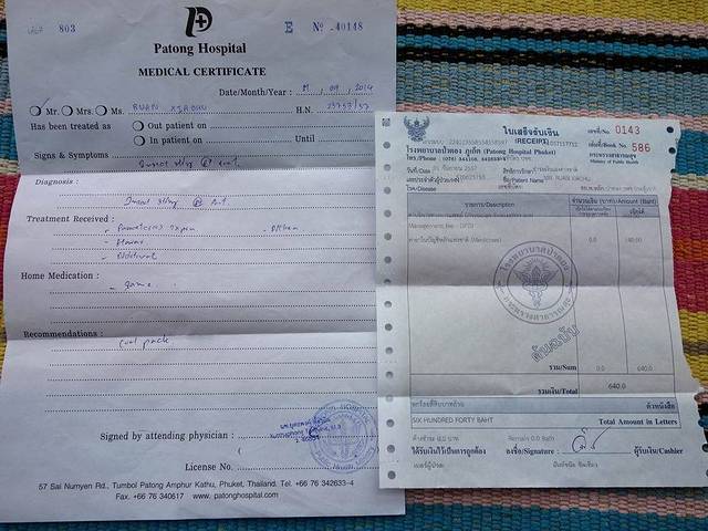 今天在蓝钻珊瑚岛上,我的右脚不幸被马蜂蜇了。马蜂蜇人很厉害,钻心的痛!导游马上给我涂了一种泰国的青草药膏,并找来了止痛药给我服下。回到巴东以后,导游和领队又一起陪我去普吉岛的医院。导游如此重视,是因为他有两个小伙伴曾经因为惊动了马蜂窝,被马蜂蜇死(当然,他们是被不止一只马蜂蜇了)。普吉岛的民居虽然比较落后,医院却非常漂亮(泰国是全民免费医疗!很遗憾,当时脚痛,没有拍照片)。医生也非常负责,在诊查了我的伤情,并征求了我的意见之后(打针还是吃药),给我开了几种对症的药。三天以后,我的脚已经痊愈。这是医院开具的诊断书和发票。本来当地导游要拿回去给我报销的(马蜂在普吉岛蜇人,他们也应该负责任吧),但辽宁康辉的领队张小姐说,已经通知国内的保险公司了,她建议我还是回国后请报名的旅行社处理吧,因为每个出国旅游的游客都有旅游人身意外险的。没想到,想在途牛报销却是一件十分困难的事!