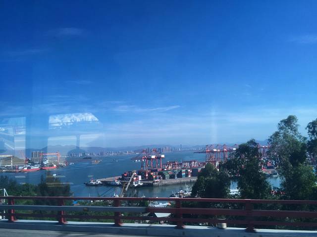 早上的天空很蓝,与港口的红色相衬,超级棒~