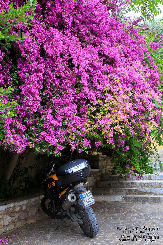 远远地看到茂盛得三角梅下停车一辆很帅气的摩托。
