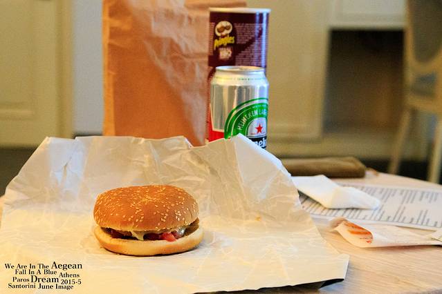 这就是今天的晚餐了,汉堡+啤酒,就着圣托里尼家乐福买的还没吃完的薯片。本来计划的日落、大餐早已成为泡影。谁都不要拉我,我要去墙角哭一会儿~~