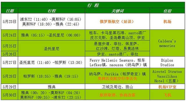 我们买的是上海到雅典的联程机票,中间莫斯科转机。出发中间预留2.5个小时转机,上海-莫斯科这段延误了两个多小时,虽然战斗民族凭借飞行速度拉回了半个小时,但飞机落地时也只有20分钟的转机时间了。京京和骏爷着实在莫斯科机场上演了一番“速度与激情”。幸好后续航班也延误了半个多小时,总算赶上了航班。但后来听早出发几天的同胞说,他们遇到延误没赶上第二程飞机,滞留莫斯科。俄航给安排了个酒店。因为他们没有俄罗斯签证,俄航特地派了两个彪形大汉跟着他们不让他们离开酒店。惨啊~~