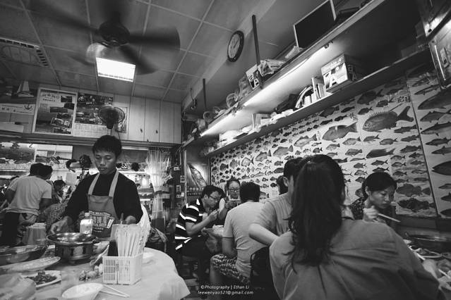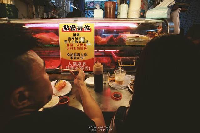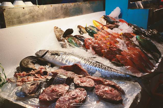 耍完后精疲力尽,骑机车到了后壁湖海鲜市场吃午饭,一进门就是辉哥生鱼片,往里走最里面是阿兴,两家都是人山人海要排号,我们选择在阿兴排上。