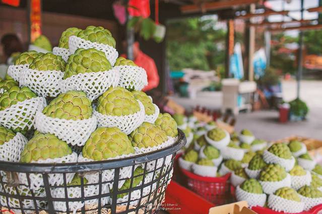 经过台东时,路旁全是大片大片的释迦树,据说全台湾的释迦都来自台东,自然在这里能买到最价廉物美的新鲜释迦。推荐这种杂交品种“凤梨释迦”,比起普通释迦来说没有那么甜腻,更香,非常好吃!