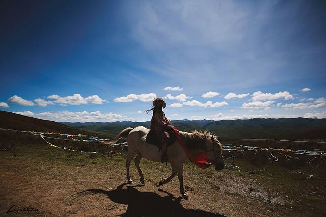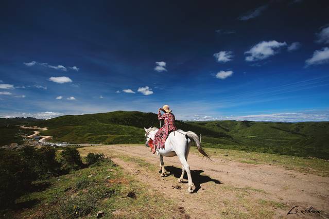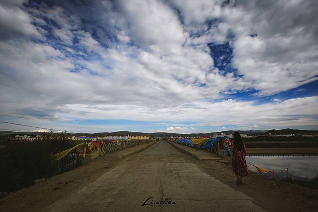 然后没心情的我开始一路漫无目的的在草原柏油马路上狂奔,路途中找了家骑马的打发时间。这里要说一下我们问了几家骑马的,价钱差距挺大的,而且风景差异也很大,建议大家多对比对比。骑完马我们回到红原县漫无目的的压马路,走到一个桥的位置感觉还不错,就在这拍起照来。