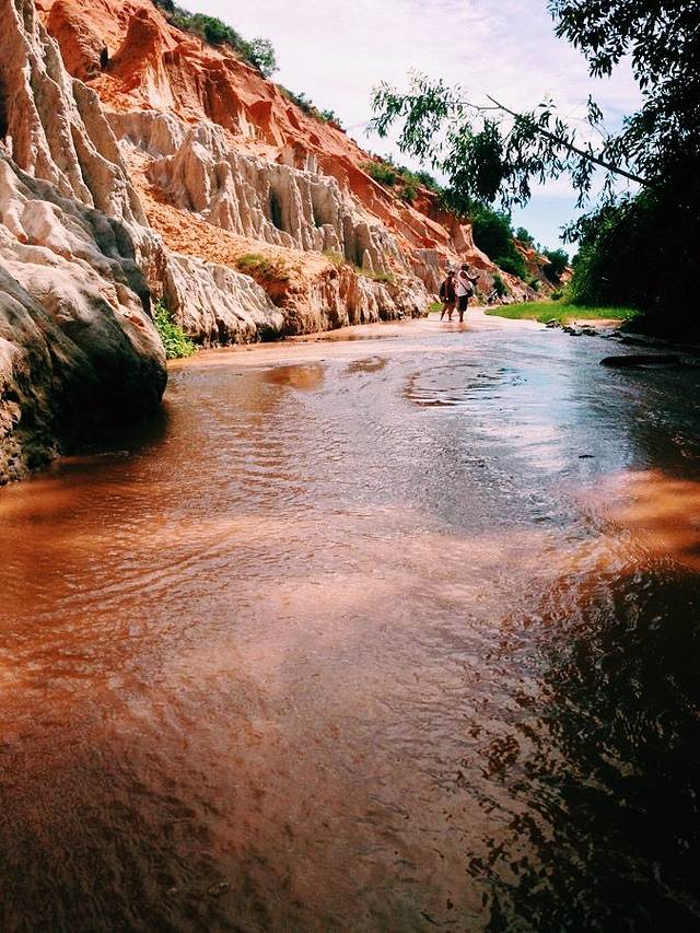 走过了一个林中酒吧,视线陡然变得开阔,溪流变宽了,高耸的岩石有着丹砂般鲜艳的橙红色,大片大片鲜绿的阔叶乔木,往水里投下斑驳的倒影,恍如两境。