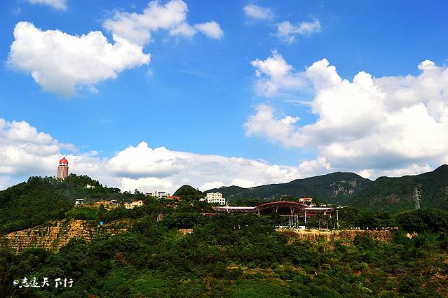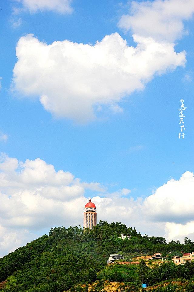 抬头东望,可见对面的一座山头上,有一座造型独特、气冲霄汉、别具一格的宏伟建筑——慈云阁。观音山景区的工作人员告诉我们,这座宏伟的建筑高约38米,有11层高,是东莞樟木头镇的地标建筑,登临阁顶,樟城全貌尽收眼底,也是他们平时的办公场所。