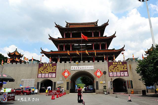 从深圳市区出发,大约一个小时车程后即可到东莞观音山景区前,叩开第一道山门,是一座清代古城楼建筑风格的门楼,飞檐翘角,气势恢宏。作为路标,同时将门内外的世界划分开来。门外车水马龙,门内悠然恬静,一条新修的马路连通内外,向山林深处延伸。