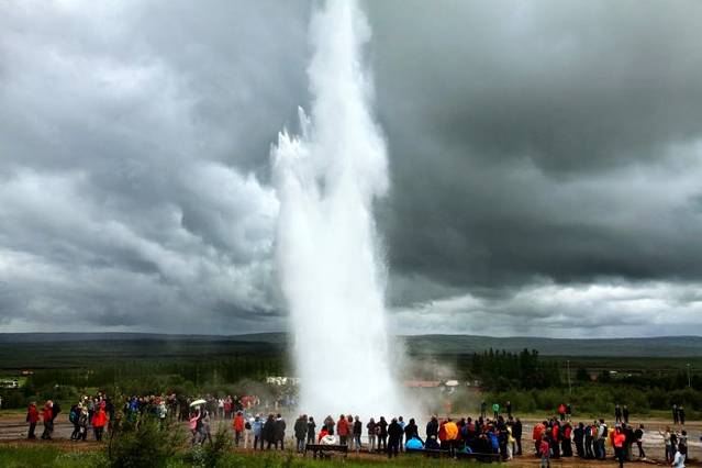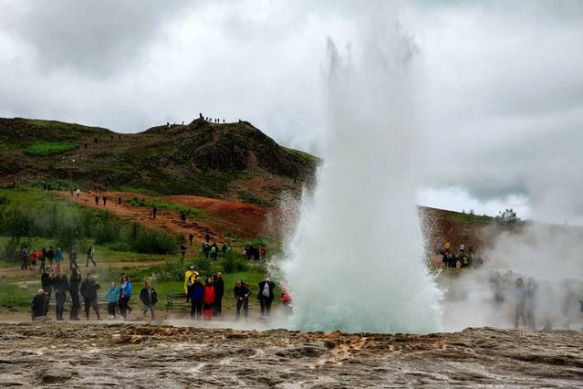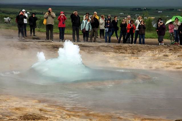 离开辛格维利尔国家公园,沿#36号公路,转#365、#37号公路来到第二个景点,Geysir间歇喷泉。估计这一地区地下是火山岩浆聚集的地方,地表有许多热气蒸腾的喷泉,最大最知名的Geysir如今已神秘地停止了喷发,幸好它的小邻居Strokkur喷泉还有表现,虽在规模上略小,但守时可靠,每隔5至8分钟便喷发出高达20米的水柱。游客都在喷泉旁等候,亲眼目睹热泉喷发的壮观景象,直径3米左右的热泉眼里热水翻滚,不时冒出气泡,突然冒出一个大气泡,热水呈蓝色半球状拱出泉眼,随后一股白色的水柱喷出泉眼,腾空而起,水柱高达20米。间歇泉周边还有好多安静的泉眼,蓝色、绿色的水潭非常好看。