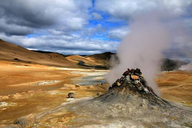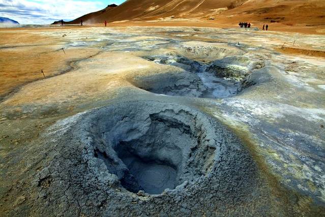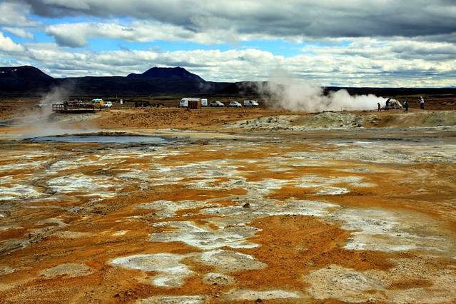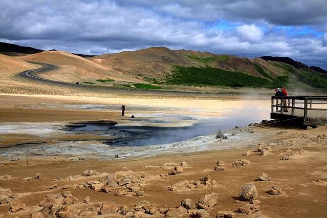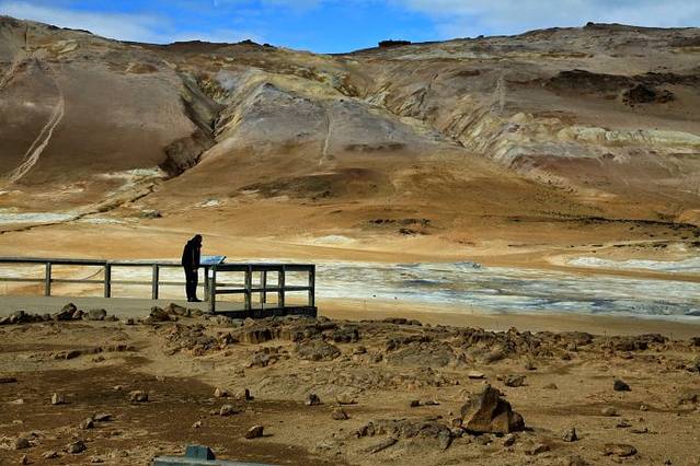 今天走#1号公路向西都是在内陆,地貌景象是高山、丘陵、火山岩戈壁,寸草不生,一片原始荒漠。上午9点多钟到达米湖风景区的第一个景点,Hverir地热坑硫磺泉,还没到那儿,就闻到硫化氢臭鸡蛋的气味。冰岛走了一大圈这里是唯一收门票的景区,门口立一招牌说明收费是为了保护和进一步开发景区,我买门票也为这个景区做点贡献。这个景区充分展示了地下炙热岩浆的威力,几个地热坑里面泥浆沸腾翻滚咕嘟咕嘟冒泡,热气蒸腾,还有几个火山岩堆砌的热气泉蒸汽兹兹不停地喷出,像厨房里蒸馒头笼屉锅。整个这一片地区都呈现出红褐色橙黄色,地下的热力把土地烤焦,这一片地就像火焰山一样。