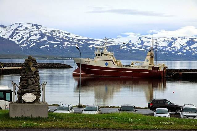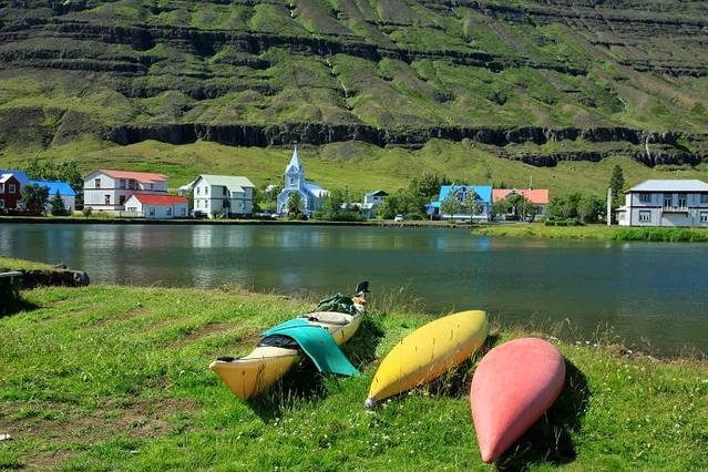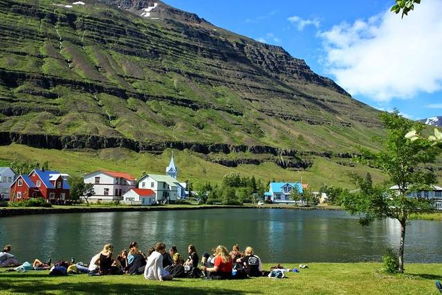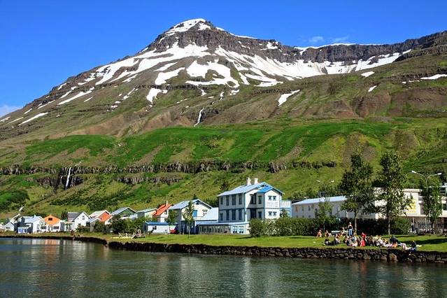 昨晚小雨淅淅沥沥下了一夜,早上起来云雾渐渐散去,能看到远处天边云中露出了蓝天。今天沿#1号公路走冰岛的东部。东部沿海都是高山,公路沿着弯弯曲曲的海岸线绕来绕去,有几处海湾伸进去很远,从海岸这边能看到海湾那边的公路,但沿海岸公路要绕一大圈才能过去。一路上很少有村庄,开车半天只路过了两个海边渔村小镇 Djupivogur 和Breiodalsvik。中午到达东部大城市Egilsstadir埃伊尔斯塔济,这时天气已经彻底放晴,蓝天白云,阳光灿烂。看旅游手册介绍,东部峡湾小镇Seydisfjordur最漂亮。从埃市出发,走#93公路翻过雪山然后下山,40分钟后到达小镇。峡湾小镇漂亮恬静,小镇三面环山一面临海,山头上还留有未融化的积雪,高山瀑布水流湍急,水湾旁盖有五颜六色的房子,湖边蓝色的教堂格外显眼,年轻人三五成群坐在湖边草地上沐浴着灿烂阳光。我徜徉在小镇街区里,沿小湖绕一圈,坐在湖边静静地欣赏着峡湾小镇美丽的景色。