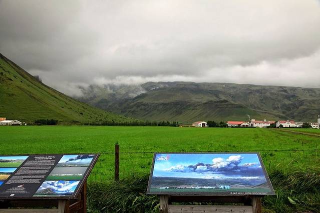 沿#1号公路继续向东走,公路左边是云雾笼罩的Mt.Eyjafjallajokull埃亚菲亚德拉冰盖山。停车来到Visit Centre,看了介绍后知道这里就是2010年4月冰岛火山爆发的地方。室内墙上贴有当年火山爆发时拍摄的照片,随后又看了记录这次火山爆发的电影,真是惊心动魄,炙热的火山灰喷向天空,红色的岩浆从火山口流淌下来,夜里看火山喷发像钢花四溅,直升飞机绕着火山口旋转,很多人慕名而来,近距离观赏火山爆发的壮丽景观。我出门看了看远处的火山,此时云山雾罩看不见山头,只能拿相机朝这个方向拍照留念。