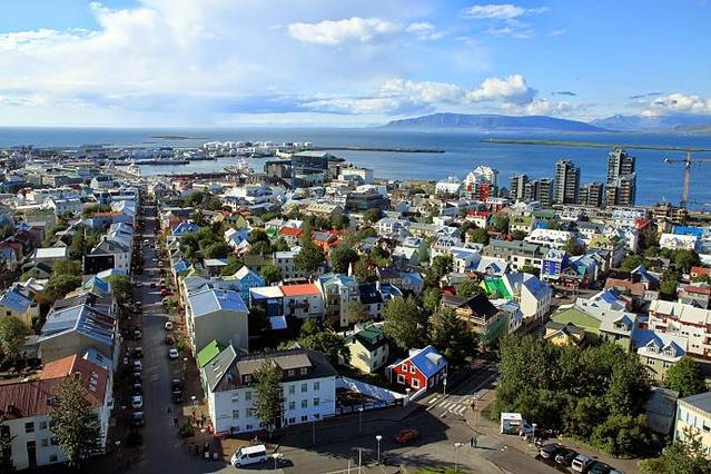 在大教堂顶层俯瞰雷克雅未克市区和远处的群山