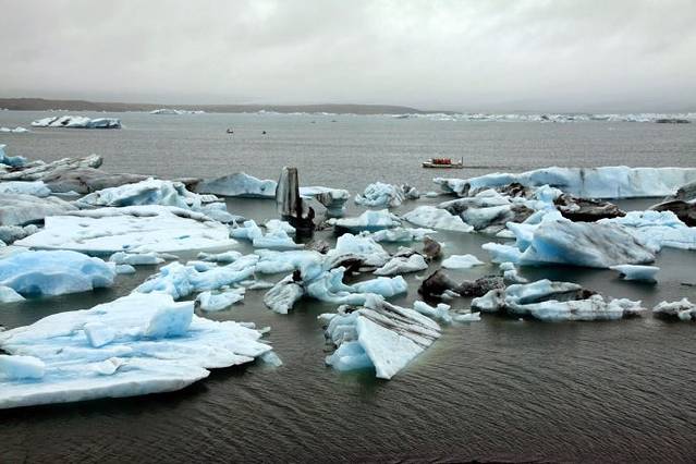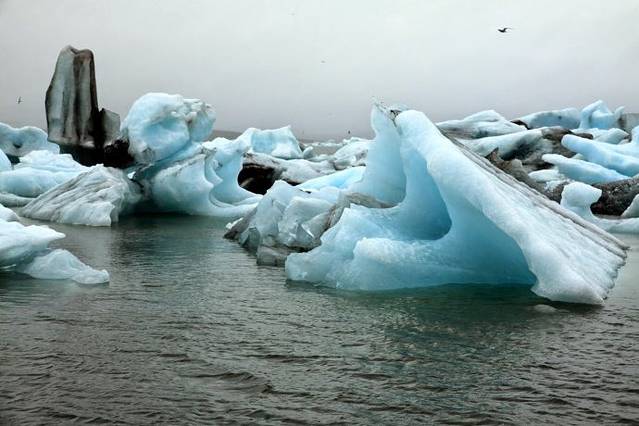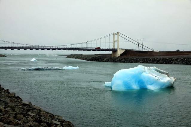 到达冰湖时天虽然不下雨了但还是阴沉沉的,湖里漂浮着大大小小形状各异的冰山、冰块,泛着幽蓝色,这些冰山都是上游冰川剥离脱落漂流到湖里,有的慢慢顺着河道漂到海里。我沿着湖边走,迎面吹来冷风嗖嗖,不禁打了一个冷战,就感觉像掉进冰窖里似的。看着水路两栖船又载着游客开到湖水里向湖中心驶去,游客都披着游艇上提供的防寒防水服,我心想这个个都是勇敢者,不怕冷风刺骨。我转了一圈天冷冻得实在扛不住了,钻进访客中心里买一杯热咖啡喝。记住到冰岛旅游,夏天也要带厚衣服,冲锋衣、羽绒服什么的,这里可真冷。
