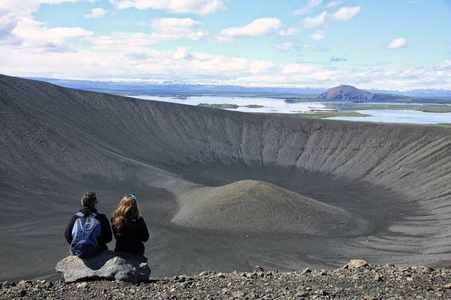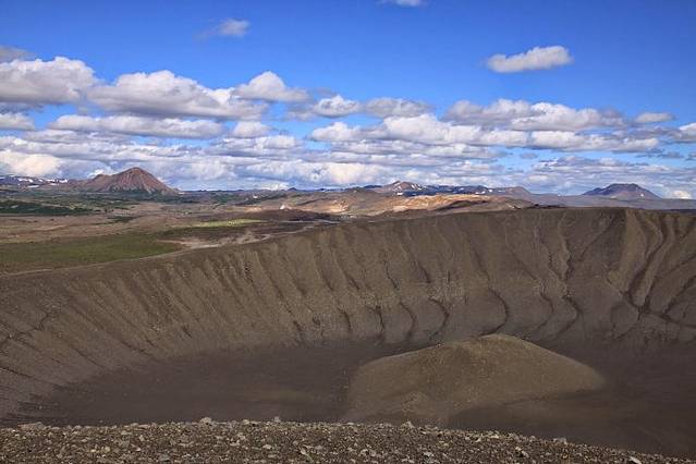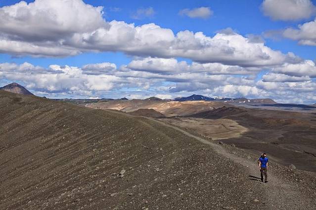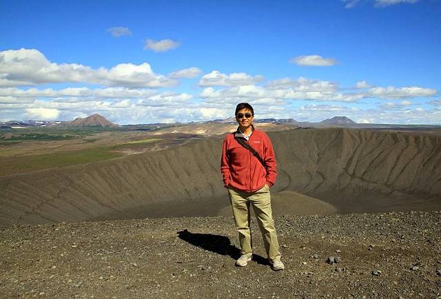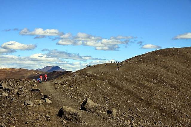 翻过火焰山,沿1号路继续西行,就到了米湖风景区的中心小镇Reykjahlid,开车穿过小镇直奔Hverfrll火山口。远远望去,火山口就像上面削平的圆锥体平地而起。停好车我吃了东西就开始爬火山口,二十多分钟后爬到火山口顶端,站在几百米高山上四处张望,视野开阔,景色宜人。圆形火山口就在脚下,巨大无比,远看有人在火山口沿着顶端的小路绕走一圈,也不知道走一圈要多长时间,既然我已爬上来了,趁着天气好就走上一圈。整个火山口都是褐色火山岩石堆积的,想必是很多很多人在上面走,乱石碎石中趟出了一条路,我顺着山顶小路走,边走边看两边的风景,约一个小时后绕完一圈,走回到起点。