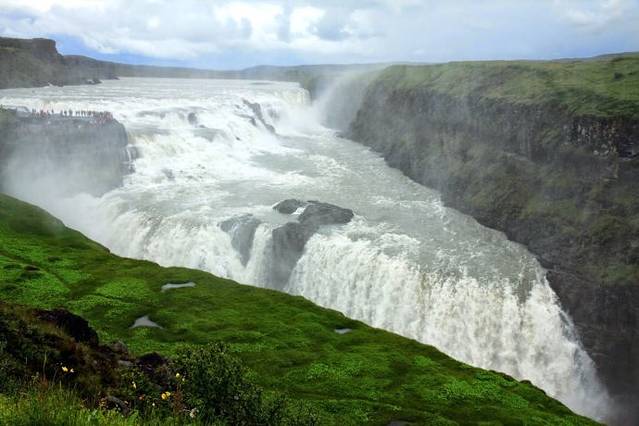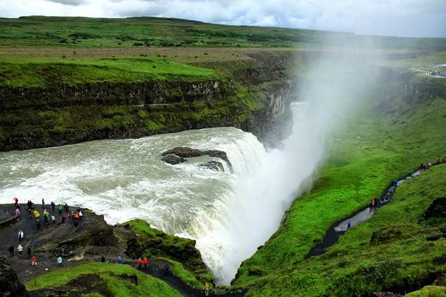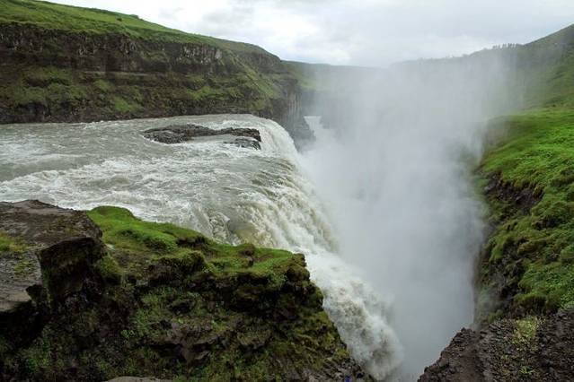 Gullfoss分上下两层瀑布,最后湍急的水流跌入一个70米纵深的峡谷中