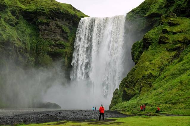 接下来景点是Skogafoss瀑布,介绍说该瀑布是冰岛最漂亮的瀑布,瀑布宽15米,高62米,巨大的水瀑从天而降,发出轰鸣的声音。在这个瀑布不但能走到近前感受瀑布的威力,还能顺着瀑布旁边的小路爬到上面,从高处观赏瀑布的美丽景色。