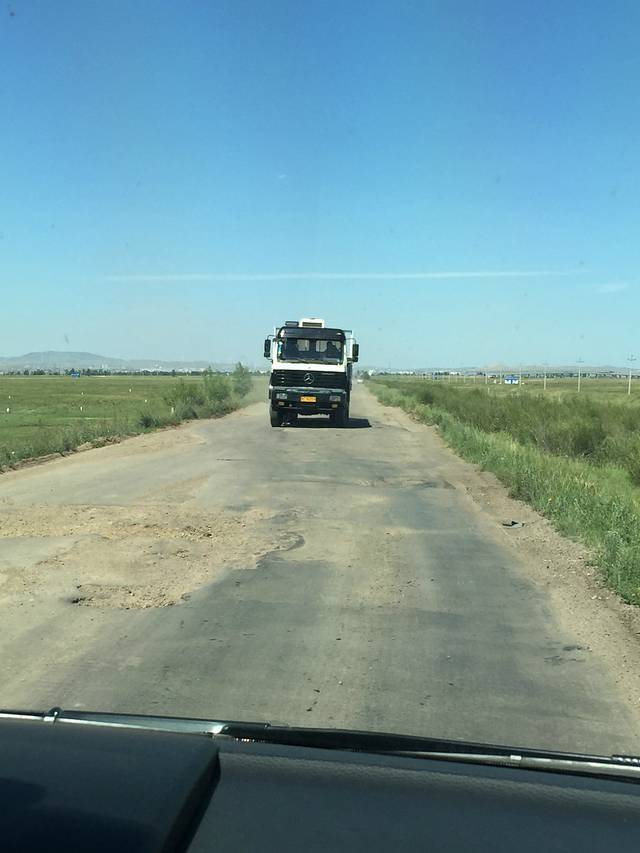 从新巴尔虎左旗出来往嵯岗方向走的路就是这种,虽然是水泥路,但是一路上没有车,一直到嵯岗分岔口都很好走,但是左转后往札赉诺尔方向走就不好了。至少走了三公里遍布大坑的烂路。