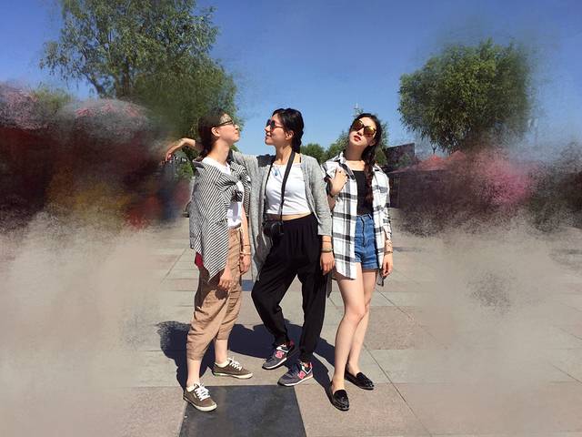 早上一起床FF就开始头痛,拉肚子,喉咙痛看,以为是昨天吃坏了就去诊所开了些药继续我们的旅程。整个上午都是在车上度过的,FF因为头疼一直靠着我的肩睡了一个上午,后来到达张掖市以后实在是受不了了就把他带到当地的一家诊所,量完体温烧到38.3℃,不得不让他呆在诊所挂点滴,然后我们仨姑娘下楼在面点随便吃了点,又帮他叫了碗甜面皮儿。让他在打点滴的同时,我们仨就前往嘉峪关,因为天气太炎热又要照顾FF,我们只在售票处门口拍了一张照片,远远地观望了一下嘉峪关。