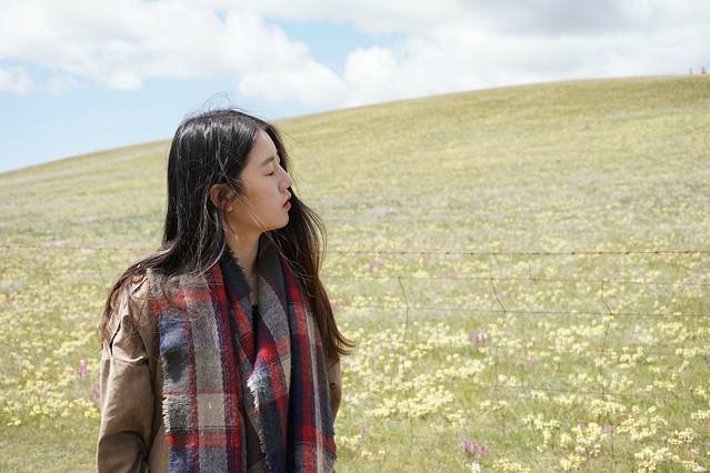 前往祁连的路上,经过一片花海。下面是丹丹SHOW。