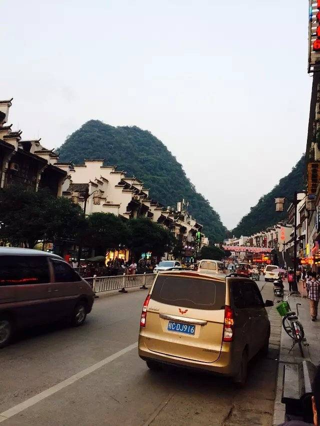 从桂林到阳朔整个车程好像是要5-6个小时的样子,我们开的不是很快。在晚上天黑之前已经到达了阳朔,第一个晚上我们就住在阳朔的西街边上,看到这么多车和人了吗,真的不建议大家住在这个附件,地方贵还不算,房间小的可怜,被子也是潮湿的,房间里面还有蜈蚣之类的。