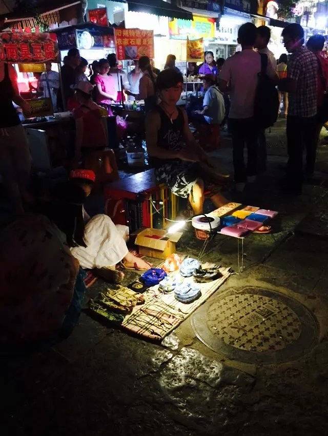 年轻的卖艺人,真的是男才女貌哦,在摊位前面放了一些手工制品,也不像其他人一样进行兜售,只是安静的拍着鼓、唱着歌,当你询问的时候会耐心的回答你,真的很喜欢这种感觉。在年少的时候,也幻想过要和心爱的人,背着音乐的吉他去浪迹天涯。