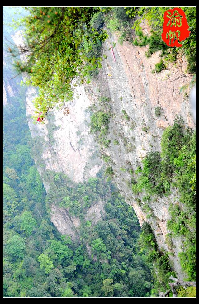 上到山顶已经是中午时分,我们简单的点了土家腊肉等几个特色佳肴,然后从后花园开始游览袁家界,我们首先见到的第一个景点是“天下第一桥”,这是一个自然形成的天然石桥,与重庆武隆的天生三硚有异曲同工之妙,此桥横跨在两山之间,桥下悬崖峭壁、奇峰林立,极其壮观。还有工作人员捆着保险绳在峭壁上飞来飞去,表演给游客助兴,惊险而精彩。小云告诉我们,此桥跨度为25米,桥下垂直高度达三百五十米,是世界上垂直高差最大的天然自生石板桥。