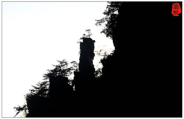 御笔峰是天子山最具代表性的景点,位于天子山西侧的山谷中,一排6根石柱,每柱高约百米,方正如削,顶天并立,参差相连,且上细下粗,形如笔杆。站在观景台向西南远眺,但见山谷数十座错落有致的秀峰突起,遥冲蓝天,靠右的石峰像倒插的御笔,靠左的石峰似搁笔的“江山”。
