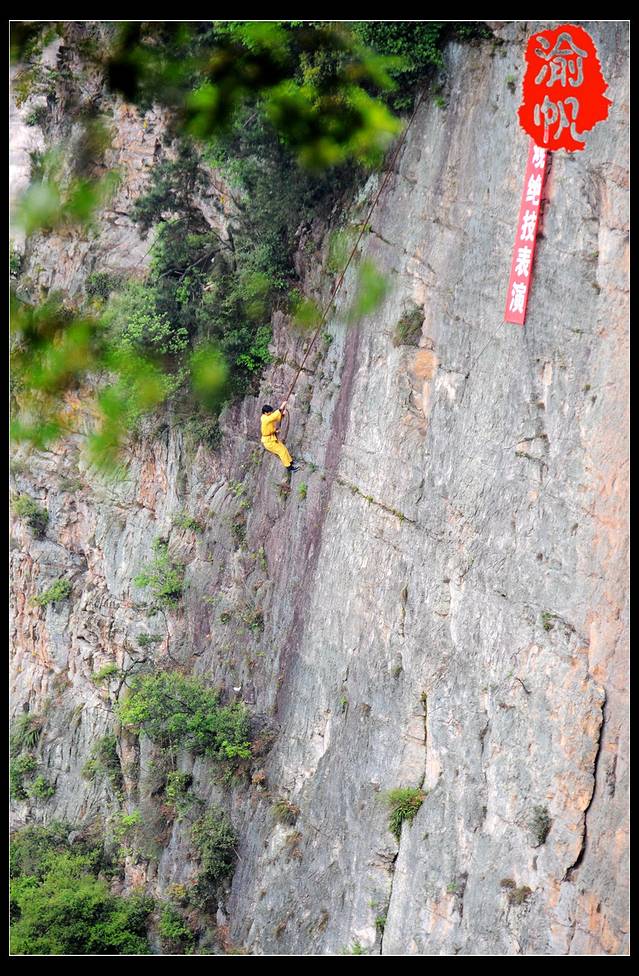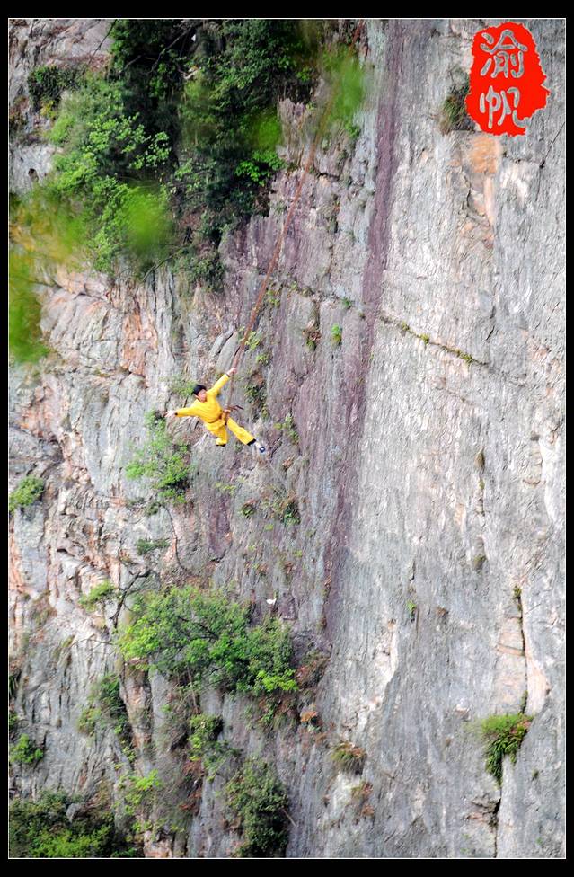 在垂直的峭壁上飞来飞去,非常惊险,真为他捏一把汗,要是绳索怱然出现问题,后果不堪设想。