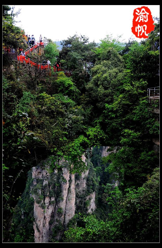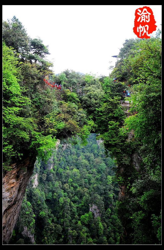 罢午餐,我们开始从后花园游览袁家界,见到的第一个景点便是天下第一桥,这是我们在桥面上的情况,上面的扶栏上,系了很多红绳及铜锁,寄托了游客美好的愿景。