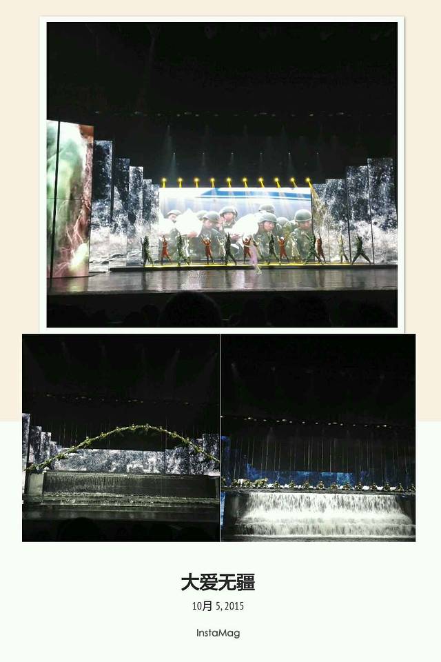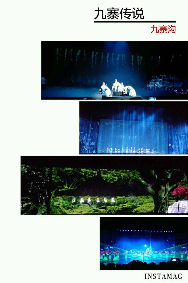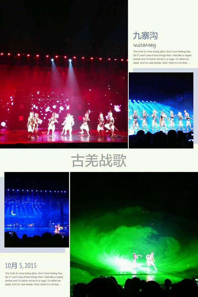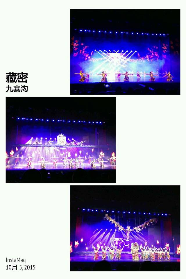 大型原生态歌舞《九寨千古情》据说是全球首创的5D剧院实景演出,广告语“一生必看的演出”。很不错的演出,演技,灯光,从天而降的水幕,互动都结合得很好,汶川抗震救灾演绎感人。