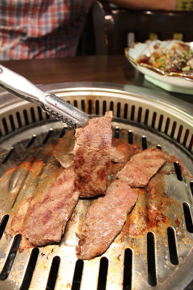 这边还没吃几口泡菜,肉和烤盘,还有蘑菇就端上来啦!看着红红的牛肉的五花肉,鲜嫩的蘑菇……现在想想都咽口水! 哈哈!烤盘上放上油滋滋的烤肉,肉香加上碳烤的香味,再来一口泡菜,真的是令人食指大动!