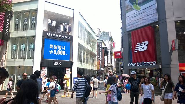 到了明洞已经是下午三点左右啦,因为我们是第二天晚上的飞机,所以我们要抓紧时间!你看站在明洞的大道上,各个国家的人都有呢,我也成了外国人啦! 即使天气挺热的,但是来明洞的游客真的很多!各种招徕顾客的手段也是五花八门!