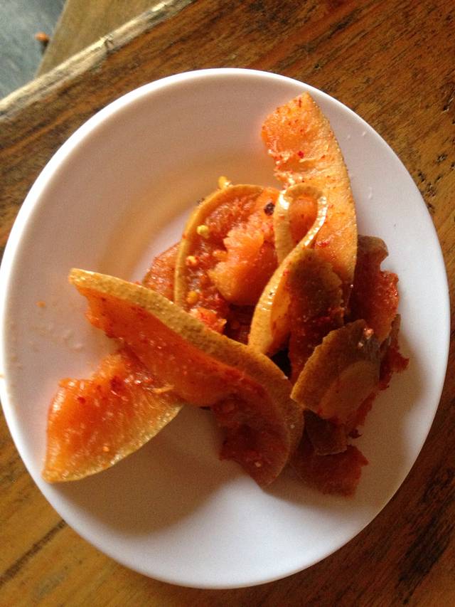 店主自制腌柚子皮,很辣,还略带苦味,不是很合我胃口